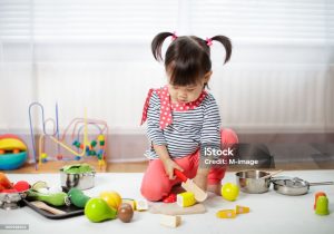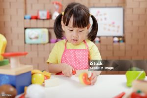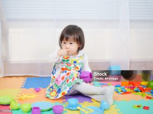 小さい子どもは、おままごとをしている時に、玩具を食べ物に見立てて、口に入れたりなめたりします。